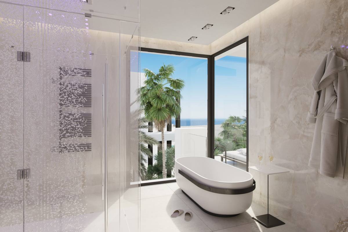 Das Außendesign der Villen in Marbella zeichnet sich durch Eleganz und Funktionalität aus. Jede Villa verfügt über einen großzügigen privaten Garten, ideal, um das mediterrane Klima zu genießen. Der private Pool ist eine Oase der Ruhe, perfekt zum Entspannen oder für Familienmomente. Darüber hinaus bieten die Terrassen zusätzlichen Raum für Unterhaltung im Freien mit Panoramablick, der die Essenz der Umgebung einfängt. Das Solarium ist ein weiteres Highlight und bietet einen exklusiven Raum, um die Sonne in völliger Privatsphäre zu genießen.