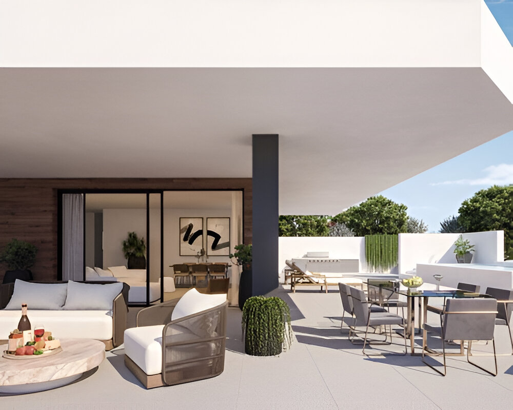 The exteriors of this residential complex in Benalmádena are designed to maximize the enjoyment of the natural surroundings and sea views. The properties feature private terraces, perfect for relaxing and enjoying the Mediterranean climate. The proximity to the sea, just 2 km away, allows for quick access to local beaches. Additionally, each home includes a garage, providing convenience and security for residents. The typology options include Apartments, ground-floor units, and Penthouses, each with its own charm and unique features.