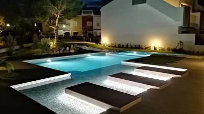 The outdoor spaces of this residential are designed to maximize enjoyment of the Mediterranean climate. The bungalows feature private terraces, perfect for relaxing outdoors. Additionally, residents can enjoy a solarium, ideal for sunbathing in a private setting. The communal garden areas offer a green space for walking or relaxing, while the communal pool and jacuzzi are perfect for cooling off and unwinding during warm summer days.