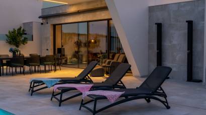 The exterior design of these villas in Rojales is intended to integrate the natural beauty of the surroundings with modern comfort. Each villa features a private garden, perfect for enjoying the Mediterranean climate. The spacious terraces offer additional outdoor space, ideal for relaxing or entertaining guests while enjoying the sea views. Additionally, the properties include a solarium, providing an elevated spot to further appreciate the surrounding landscape. The proximity to the sea, just 4.6 km away, allows for enjoying the sea breeze and coastal walks whenever desired.