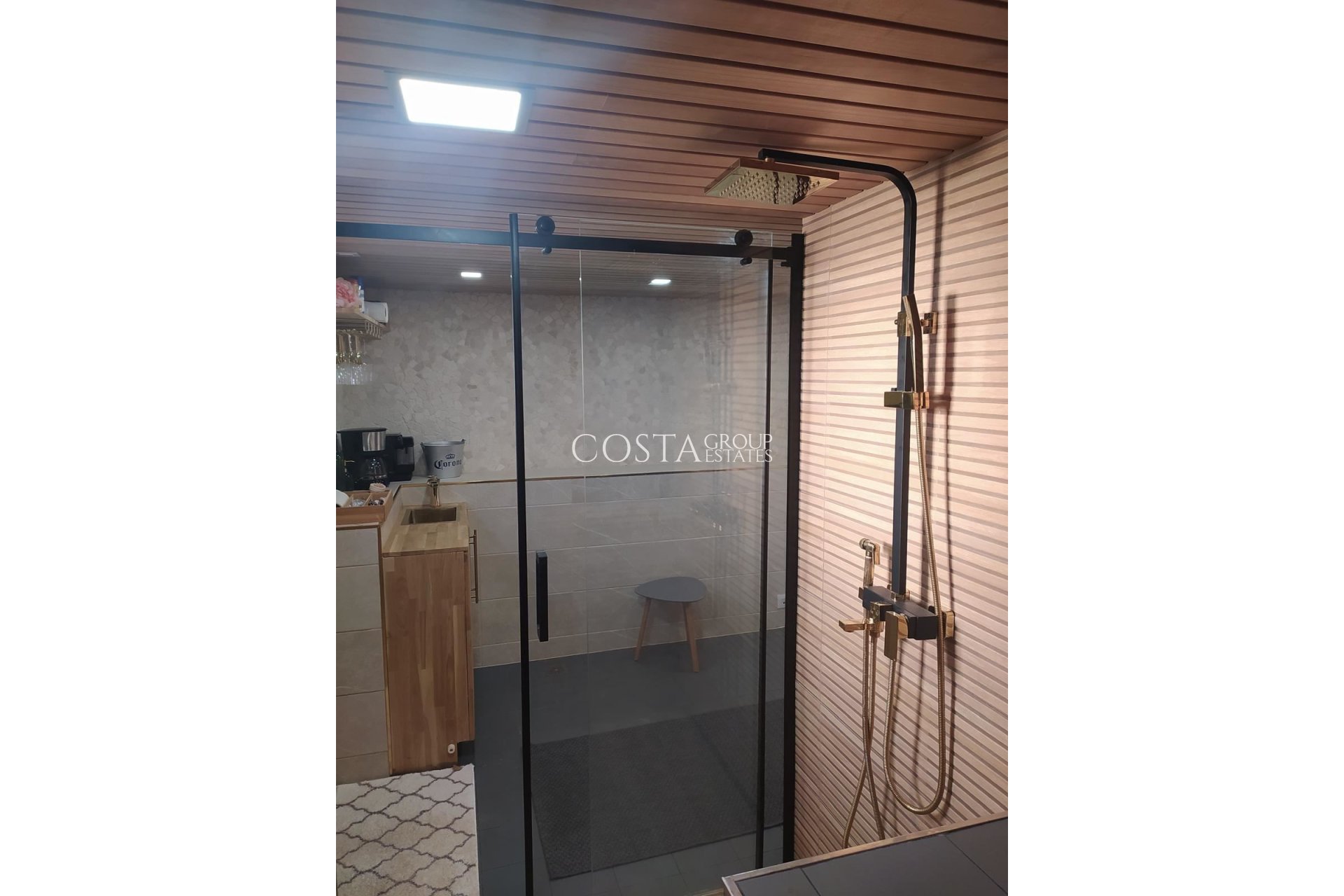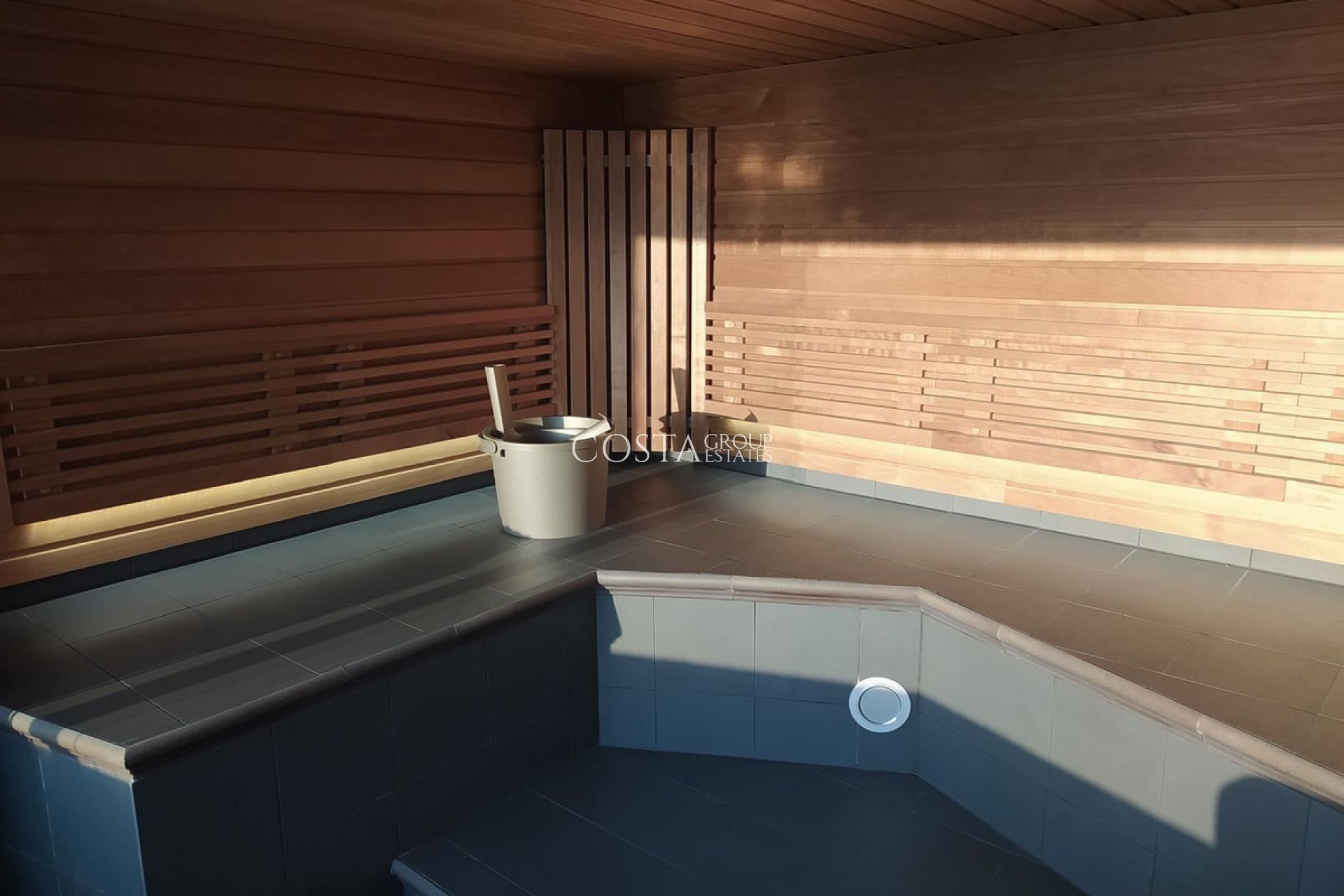Modern family villa with garden, sauna and pool Modern family villa with garden, sauna and pool - a home to enjoy Welcome to this stylish three-story villa with a total of 193 m², perfect for the large family or those who want plenty of space. The house offers four spacious bedrooms and four fully tiled bathrooms, all distributed over a well-planned area with thoughtful details. The property is situated on a generous plot of 590 m² and has a lovely west-facing terrace where you can enjoy the afternoon sun. The private garden invites you to socialise, play and relax – there is also access to a communal pool and sauna for extra quality of life. The home features built-in wardrobes, storage space and air conditioning, providing a comfortable indoor climate all year round. Parking space is included in the price. A home where comfort meets function – ready to move into!