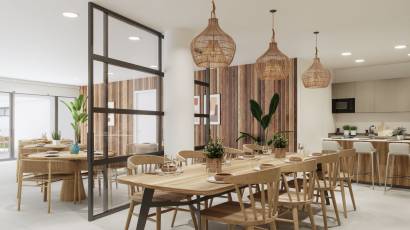 À l'intérieur des logements, le design se concentre sur le confort et l'élégance. Les appartements, rez-de-chaussée et penthouses offrent une distribution flexible avec des options de 1, 2 ou 3 chambres et 1 ou 2 salles de bains, s'adaptant à différents besoins familiaux. Les sols en stratifié et grès cérame apportent une touche moderne et un entretien facile. L'inclusion de la climatisation et d'appareils électroménagers haut de gamme assure un environnement confortable et fonctionnel. Les placards intégrés optimisent l'espace de rangement, tandis que l'interphone vidéo ajoute un niveau supplémentaire de sécurité.