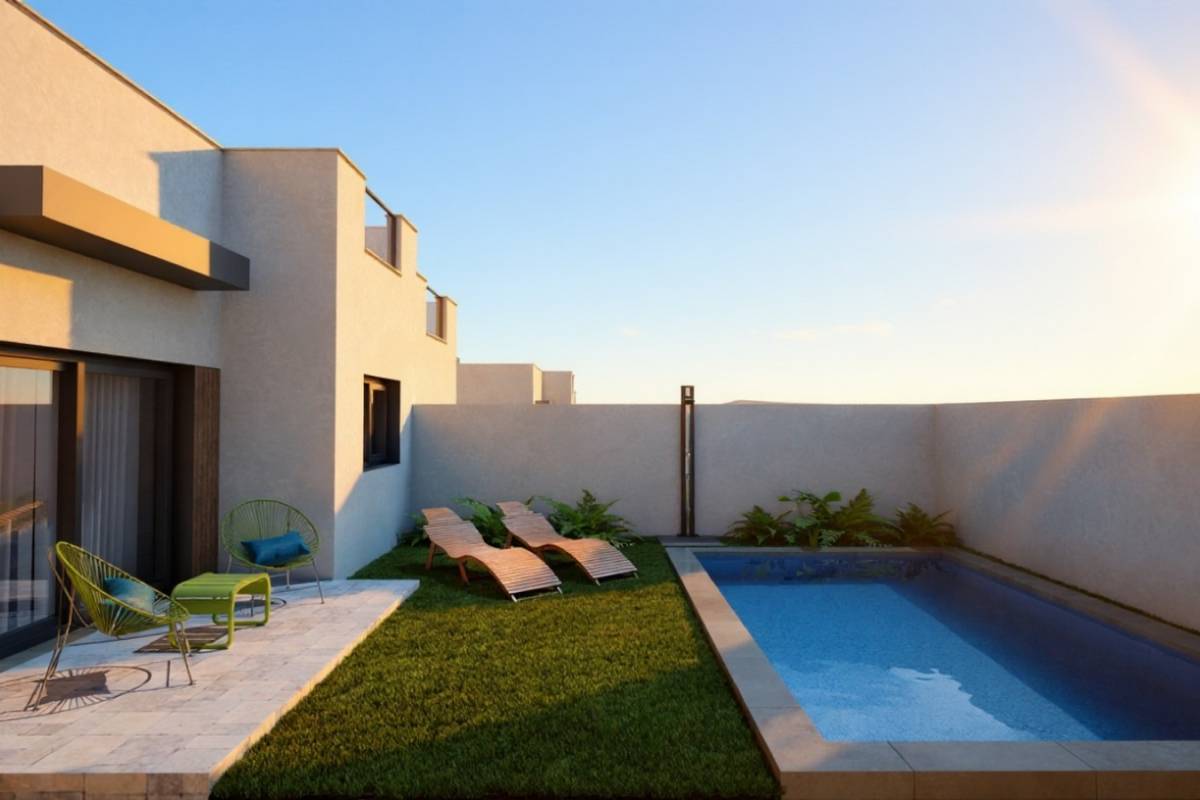 De buitenkant van deze geschakelde woningen is simpelweg indrukwekkend. Elke woning beschikt over een privé tuin, perfect om te genieten van het zonnige weer in Mazarrón. Daarnaast bevatten de woningen een terras, ideaal om buiten te ontspannen of om te genieten van maaltijden in de open lucht met vrienden en familie. Voor degenen die van zwemmen houden, heeft elke woning een privézwembad, wat een persoonlijke oase biedt om af te koelen tijdens de warme zomerdagen. Het buitendesign is bedoeld om privacy en comfort te bieden, waardoor elke woning een perfect toevluchtsoord wordt.