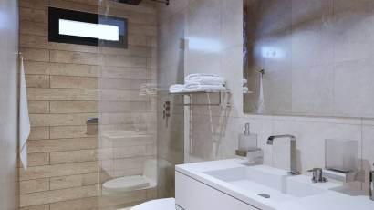 Binnen is de tussenwoning ontworpen om maximaal comfort te bieden. Met twee slaapkamers is het ideaal voor kleine gezinnen of koppels die extra ruimte wensen. De twee badkamers zorgen voor comfort en privacy voor alle bewoners. De woning is uitgerust met huishoudelijke apparaten, wat het dagelijks leven vanaf dag één vergemakkelijkt. Ingebouwde kasten bieden efficiënte opslag, waardoor de ruimte netjes en rommelvrij blijft. Bovendien is er een pre-installatie voor airconditioning, wat zorgt voor een aangename sfeer gedurende het hele jaar.
