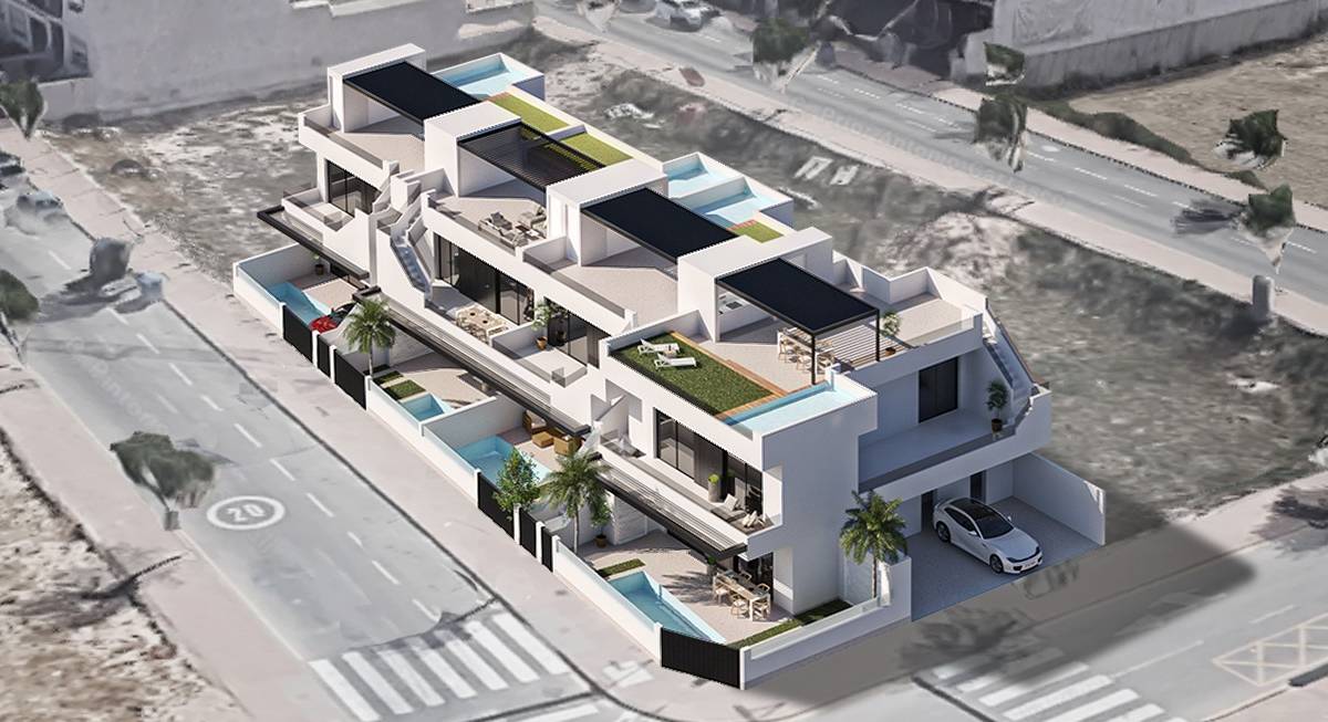 De buitenruimtes van deze woningen zijn ontworpen om maximaal te genieten van het mediterrane klimaat. Elke bungalow heeft zijn eigen privétuin, een ideale ruimte om te ontspannen of te genieten van buitenactiviteiten. De ruime terrassen bieden een perfecte plek om buiten te dineren of gewoon van het uitzicht te genieten. Bovendien stelt de toevoeging van een solarium in elke woning bewoners in staat om het hele jaar door optimaal van de zon te profiteren. De aanwezigheid van een pergola voegt een vleugje elegantie en functionaliteit toe, biedt schaduw en extra ruimte voor entertainment. Voor degenen die willen afkoelen, heeft elke bungalow een privézwembad, waardoor het huis een persoonlijke oase wordt.