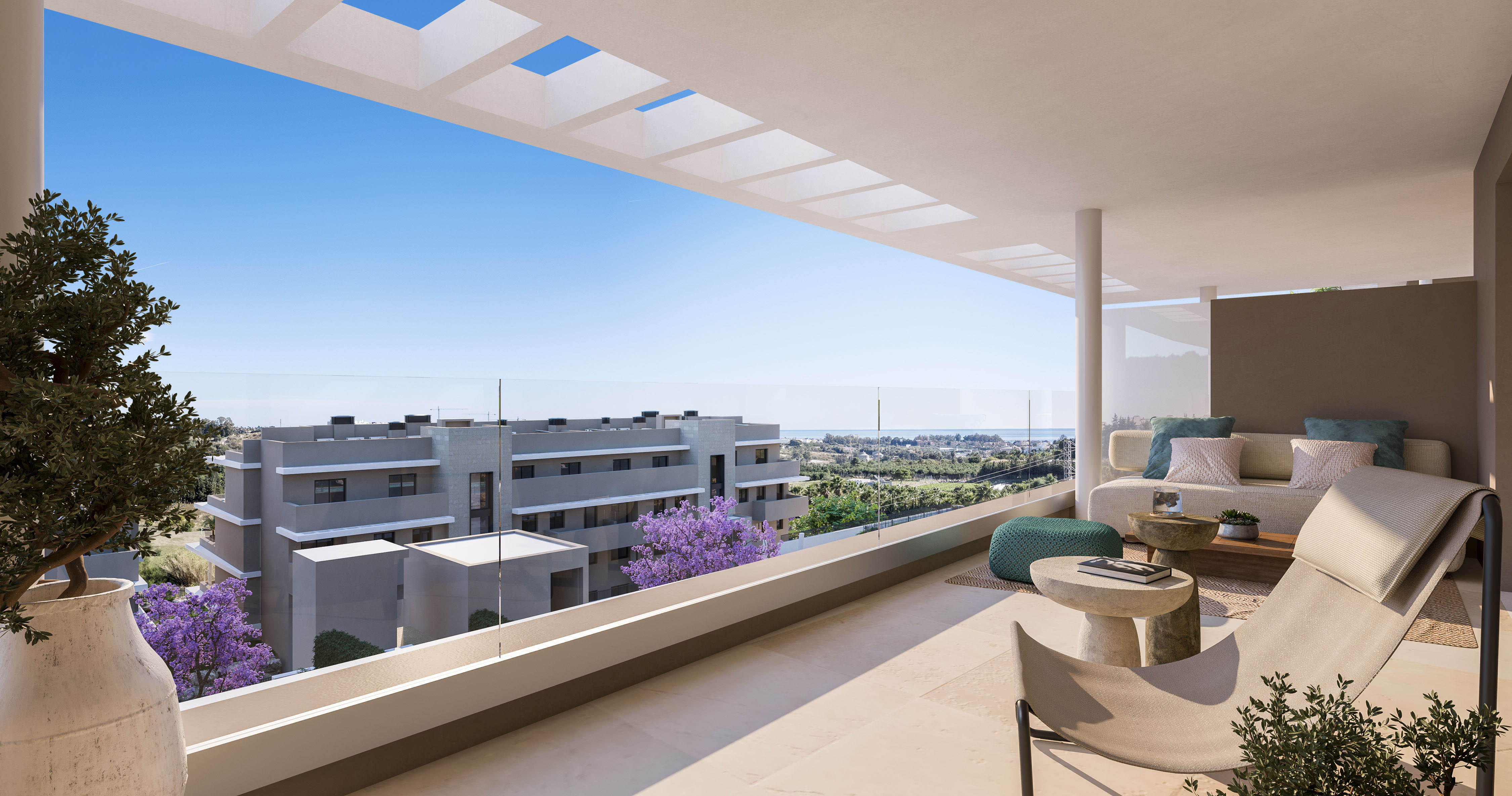 De buitenruimtes van deze woningen zijn ontworpen om optimaal te profiteren van het mediterrane klimaat van Estepona. Veel van de eigendommen hebben privéterrassen, ideaal om te genieten van het uitzicht op zee en de natuurlijke omgeving. Bovendien bevatten sommige typen een solarium, wat extra buitenruimte biedt om te ontspannen of te socializen. De begane grond biedt het voordeel van privé tuinen, perfect voor degenen die op zoek zijn naar een persoonlijke groene ruimte. De locatie op slechts 2 km van de zee maakt het mogelijk om te genieten van kustwandelingen en buitenactiviteiten, waardoor dit residentieel een aantrekkelijke optie is voor natuurliefhebbers en zee-enthousiastelingen.