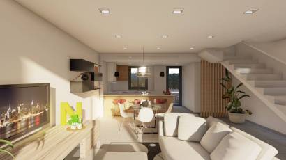Das Innere der Reihenhäuser ist so gestaltet, dass es einen gemütlichen und funktionalen Raum bietet. Mit Optionen für 2 und 3 Schlafzimmer ist jede Wohnung darauf ausgelegt, den Bedürfnissen verschiedener Familientypen gerecht zu werden. Die Bäder, alle modern und gut ausgestattet, bieten Komfort und Privatsphäre. Elektrische Rollläden und enthaltene Geräte erleichtern den Alltag, während Einbauschränke effiziente Stauraumlösungen bieten. Die Anordnung der Innenräume ist sorgfältig geplant, um das natürliche Licht zu maximieren und in jeder Ecke des Hauses eine warme und einladende Atmosphäre zu schaffen.