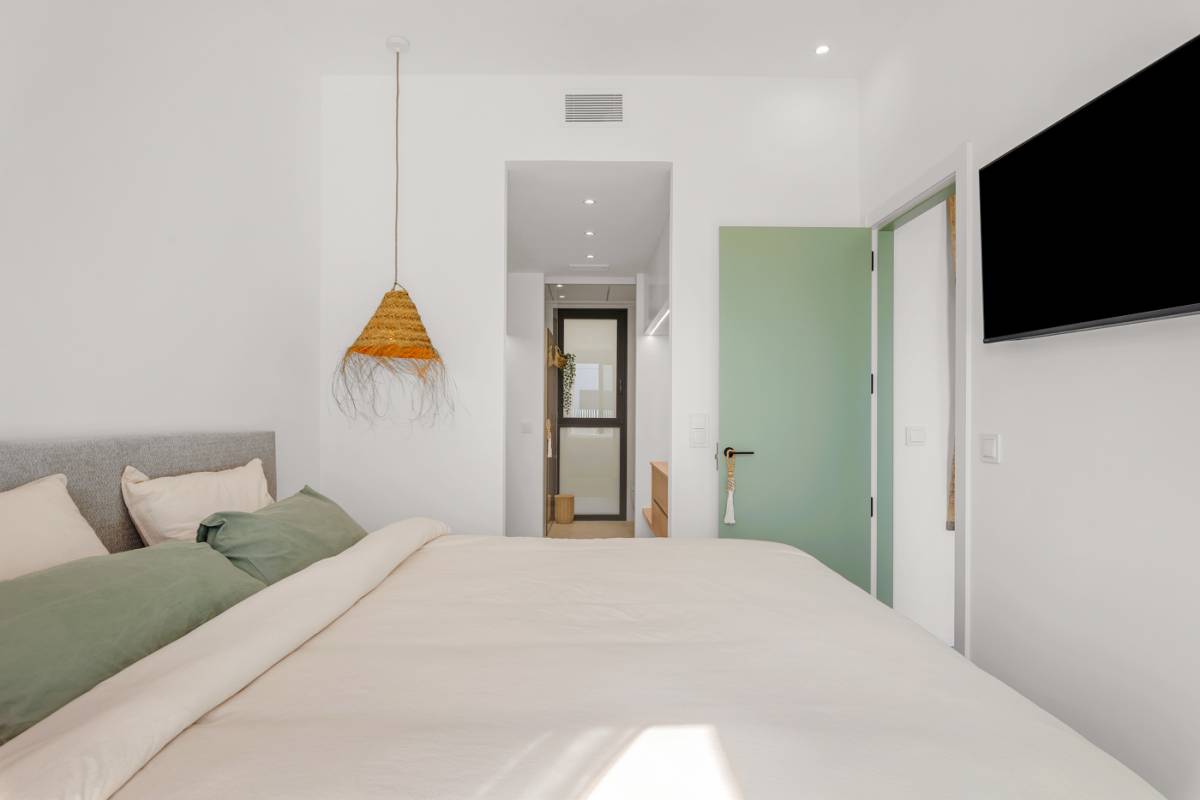 Das Innere der Reihenhäuser ist mit einem Fokus auf Funktionalität und Komfort gestaltet. Mit einer Aufteilung, die drei Schlafzimmer und zwei Badezimmer umfasst, ist jeder Raum optimiert, um Komfort und Privatsphäre zu bieten. Die Böden aus Feinsteinzeug verleihen einen Hauch von Eleganz und sind pflegeleicht, was sie ideal für den täglichen Gebrauch macht. Einbauschränke in den Schlafzimmern bieten effizienten Stauraum und halten die Räume aufgeräumt und organisiert. Die modernen Geräte sorgen dafür, dass die Küche ab dem ersten Tag einsatzbereit ist, was den Alltag der Bewohner erleichtert. Das Klimaanlagensystem garantiert das ganze Jahr über eine angenehme Umgebung, angepasst an die Bedürfnisse jeder Jahreszeit.
