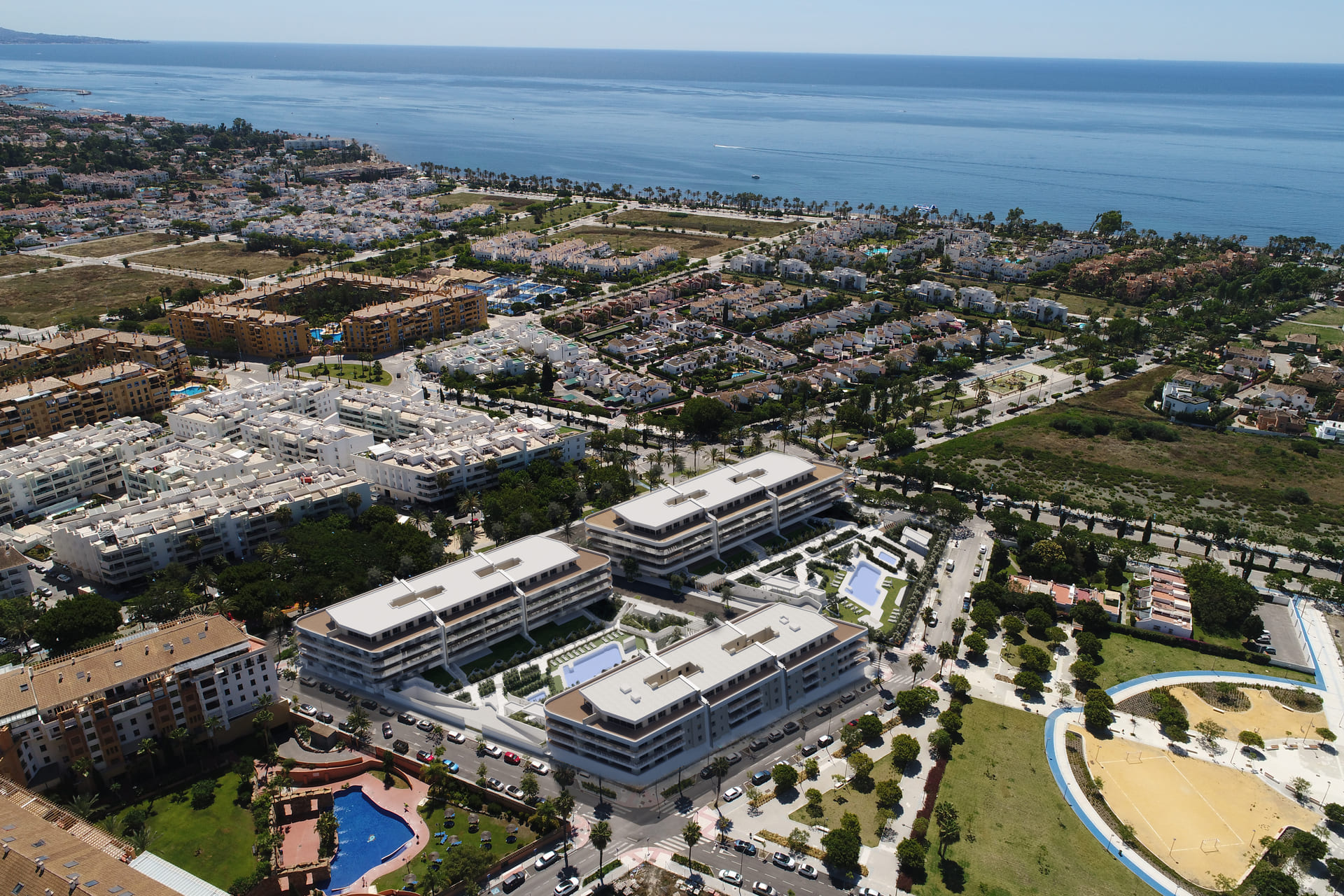 Die Wohnungen dieses Wohnkomplexes in Marbella sind mit hochwertigen Merkmalen ausgestattet, um maximalen Komfort zu gewährleisten. Die Böden aus Feinsteinzeug verleihen Eleganz und Langlebigkeit. Elektrische Rollläden und Klimaanlage sorgen das ganze Jahr über für ein angenehmes Ambiente. Die Küchen sind mit modernen Geräten komplett ausgestattet, was den Alltag erleichtert. Einbauschränke bieten viel Stauraum und halten jedes Zimmer ordentlich und funktional. Die Immobilien sind in Konfigurationen mit 2, 3 und 4 Schlafzimmern sowie 2 oder 3 Bädern erhältlich und passen sich den Bedürfnissen verschiedener Familientypen an.