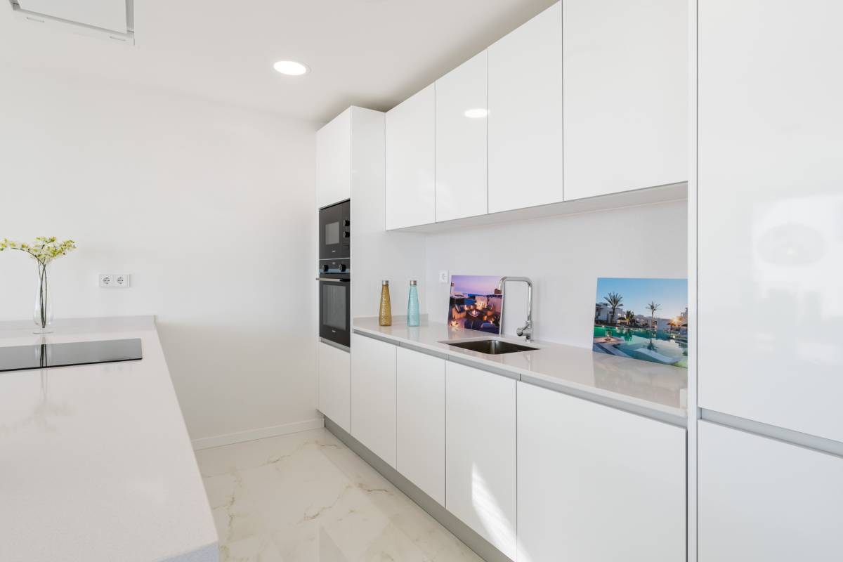 The exteriors of these properties have been designed to maximize enjoyment of the Mediterranean climate. Each home features a private terrace, perfect for relaxing while gazing at the sea. Additionally, the Penthouses include a solarium, providing extra outdoor space for sunbathing or enjoying outdoor gatherings. For those seeking an extra touch of luxury, some properties feature a private pool, offering a personal oasis of tranquility. The integration of electric blinds and a video intercom system ensures both comfort and security, allowing full control over the outdoor environment.