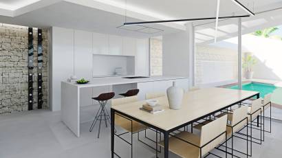 The exterior design of the villas in Pueblo Mascarat is intended to maximize enjoyment of the natural surroundings. Each villa features a private garden, perfect for enjoying the outdoors in an intimate setting. The spacious terraces offer an ideal space to relax or entertain guests while enjoying the sea views. Additionally, each property has a private pool, providing a personal oasis to cool off on hot days. The inclusion of a private garage ensures convenience and security for vehicles.