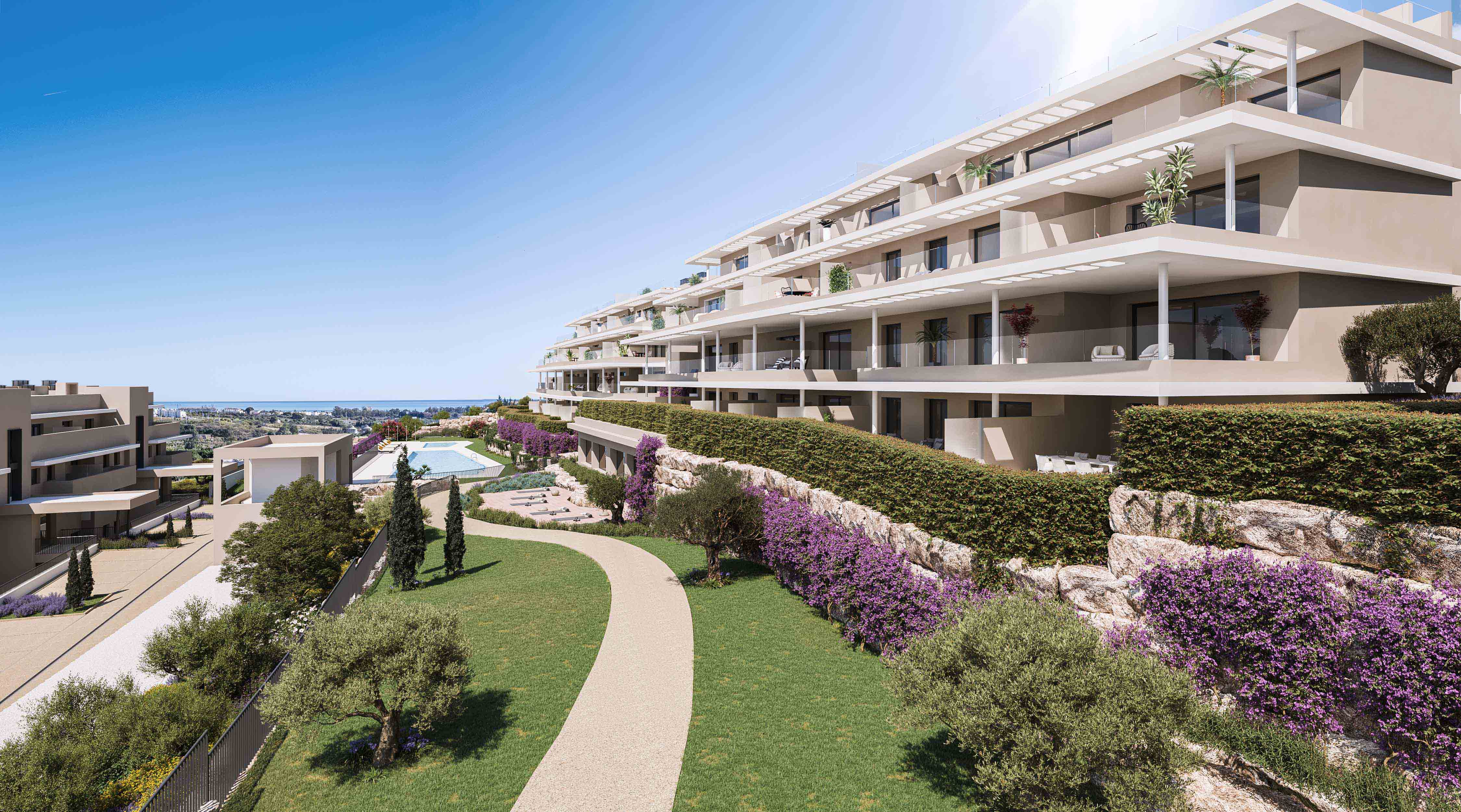 The exteriors of these homes are designed to make the most of Estepona's Mediterranean climate. Many properties feature private terraces, ideal for enjoying sea views and the natural surroundings. Additionally, some types include solariums, providing extra outdoor space for relaxation or socializing. The ground floors offer the advantage of private gardens, perfect for those seeking a personal green space. The location just 2 km from the sea allows for coastal walks and outdoor activities, making this residential an attractive option for nature and sea lovers.