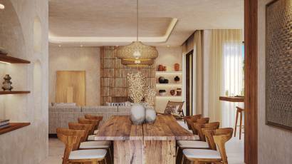 L'intérieur de la villa est conçu pour offrir confort et fonctionnalité. Elle dispose de trois chambres, toutes avec des placards intégrés qui optimisent l'espace de rangement. Les quatre salles de bains sont équipées de chauffage au sol, assurant un confort thermique optimal tout au long de l'année. La cuisine est équipée d'appareils modernes, facilitant les tâches quotidiennes et contribuant à un style de vie pratique et efficace. Le design intérieur se concentre sur l'espace et la luminosité, créant une ambiance accueillante et élégante.