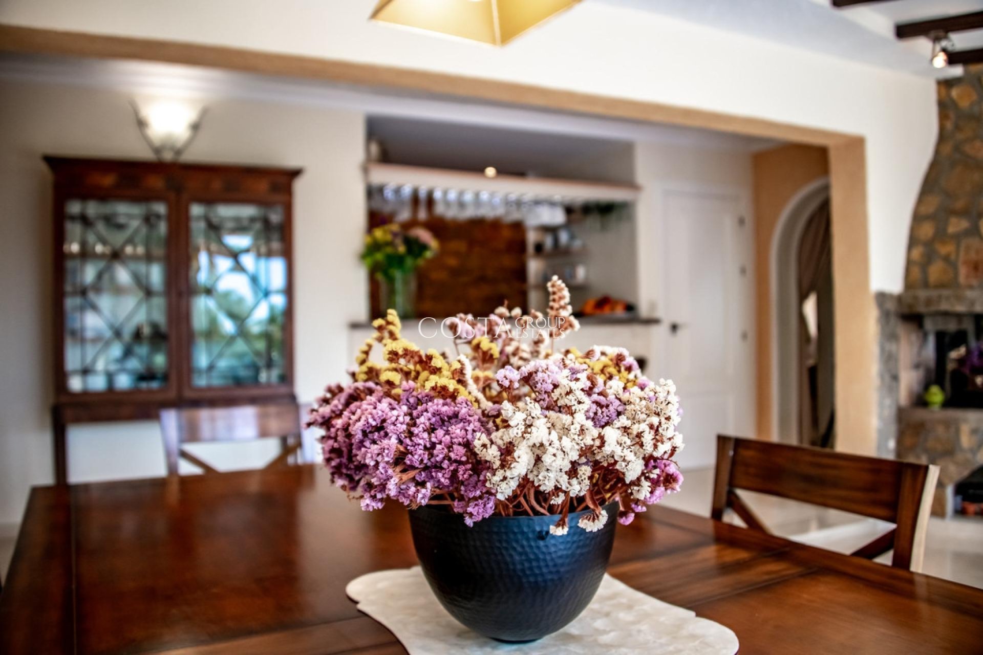 (EN) FOR SALE UNFURNISHEDThis stunning villa is for sale in the prestigious Canuta de Ifach urbanization in Calpe. Its prime location, just 63 km from Alicante, an hour's drive from Elche Airport, and an hour and a half from Valencia, makes this villa the perfect choice for comfortable living or unforgettable vacations.The villa, built on top of a terrace with breathtaking views of the valley, is spread across three levels. The upper level houses the main living area, the middle level features a stylish swimming pool, and the lower level is dedicated to a picturesque garden with a barbecue area, summer dining area, pond, and a children's playground.The main house is divided into two floors. On the first floor, you will find a spacious living room with a fireplace, a fully equipped kitchen, and three bedrooms, each with its own en-suite bathroom and dressing room. The second floor features an independent apartment with a living room, fireplace, a bedroom with sea views, and a private bathroom.Additionally, the property includes a cozy guest house with a kitchen, bedroom, and bathroom, perfect for hosting friends or family. There is also a closed garage and parking space for two cars.This villa offers everything needed for comfortable living: bright, spacious rooms, modern heating and air conditioning systems, as well as privacy and exceptional comfort. Feel free to contact us for more information or to arrange a viewing!