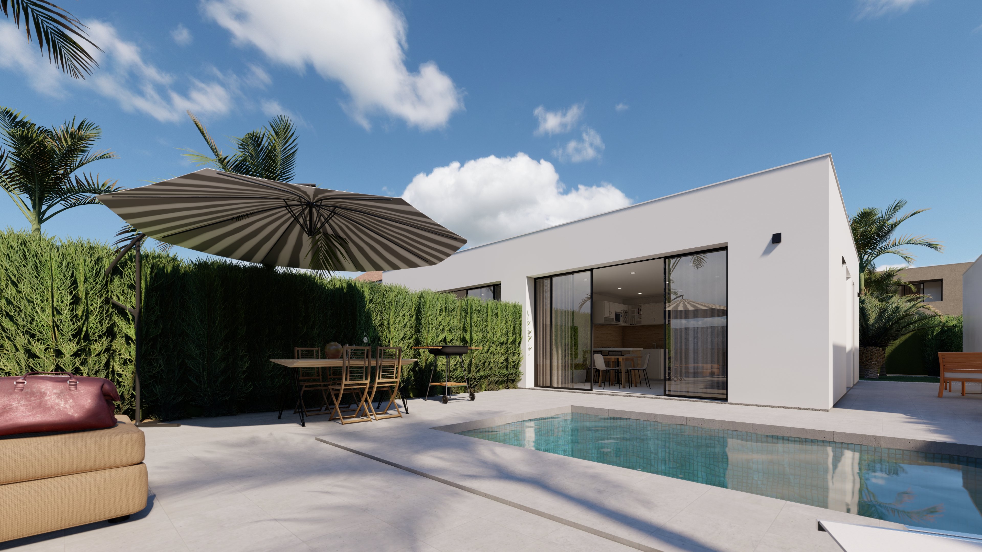 Przestrzenie zewnętrzne tych niezależnych domów w Murcji zostały zaprojektowane, aby zapewnić miejsce do relaksu i cieszenia się na świeżym powietrzu. Każda nieruchomość posiada prywatny ogród, idealny do rodzinnych aktywności lub po prostu do cieszenia się śródziemnomorskim klimatem. Dodatkowo, tarasy zapewniają dodatkową przestrzeń do wypoczynku, umożliwiając podziwianie widoków i naturalnego otoczenia. Włączenie prywatnego basenu w każdym domu dodaje element luksusu i ekskluzywności, przekształcając dom w osobisty raj.