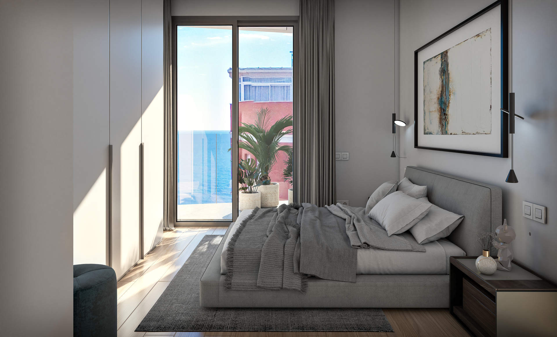 Wnętrza apartamentów i penthousów zostały zaprojektowane tak, aby oferować nowoczesną i przytulną atmosferę. Mieszkania posiadają dwie sypialnie i dwie łazienki, zapewniając przestrzeń i prywatność dla wszystkich członków rodziny. Podłogi łączą gres i panele podłogowe, dodając elegancji i ciepła. Kuchnia jest wyposażona w nowoczesne urządzenia, ułatwiając codzienne obowiązki. Komfort zapewnia klimatyzacja i rolety elektryczne, a wbudowane szafy oferują praktyczne i efektywne rozwiązania do przechowywania. Bezpieczeństwo i wygoda są wzmocnione przez wideodomofon.