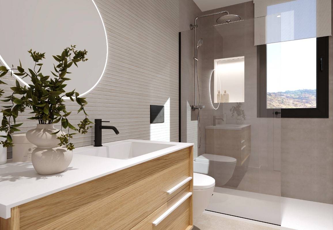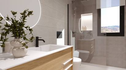 Het interieur van deze vrijstaande woningen in Finestrat is ontworpen om maximaal comfort en functionaliteit te bieden. Elke woning beschikt over drie slaapkamers en drie badkamers, wat een ruime en comfortabele ruimte biedt voor het hele gezin. De integratie van een domoticasysteem maakt het eenvoudig om verschillende aspecten van het huis te bedienen, terwijl elektrische rolluiken en de video-intercom een extra niveau van comfort en veiligheid bieden. De privé garage zorgt voor een gemakkelijke en veilige toegang tot de woning.
