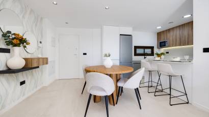 Het interieur van de woningen is zorgvuldig ontworpen om comfort en moderniteit te bieden. De porseleinen tegelvloeren geven een elegante uitstraling en zijn gemakkelijk te onderhouden. De woningen zijn uitgerust met moderne apparaten, waardoor de keuken zowel functioneel als stijlvol is. Elektrische rolluiken en de video-intercom voegen een extra niveau van comfort en veiligheid toe. De ingebouwde kasten in de slaapkamers bieden veel opbergruimte, waardoor de ruimtes netjes en opgeruimd blijven. De indelingsopties omvatten woningen met 2 en 3 slaapkamers, allemaal met 2 badkamers, wat voldoende ruimte biedt voor gezinnen van verschillende groottes.