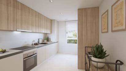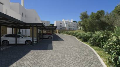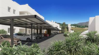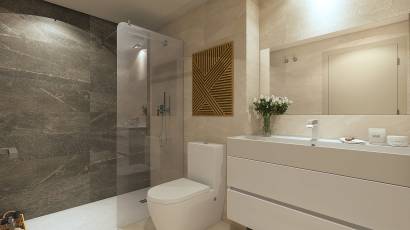De buitenruimtes van deze residentie in Mijas zijn ontworpen om optimaal te genieten van het mediterrane klimaat. Elke woning heeft een privéterras, ideaal om buiten te ontspannen en van het uitzicht te genieten. Bovendien bevatten sommige typen een solarium, dat extra ruimte biedt voor ontspanning en recreatie. De nabijheid van de golfbaan, op slechts 0,1 km, biedt een groene en rustige omgeving, perfect voor degenen die van natuur en sport houden. De gebruikte materialen voor de buitenruimtes, zoals de tegelvloer, zorgen voor duurzaamheid en eenvoudig onderhoud, en vullen het moderne en functionele ontwerp van de woningen aan.
